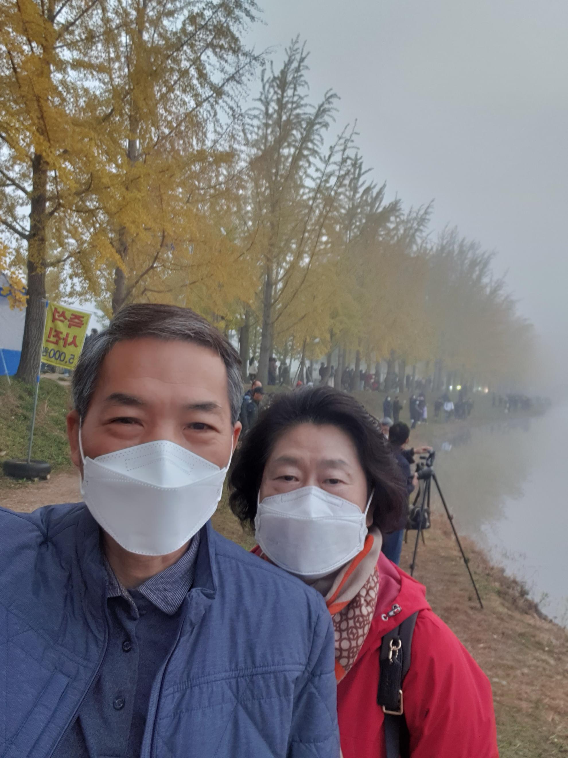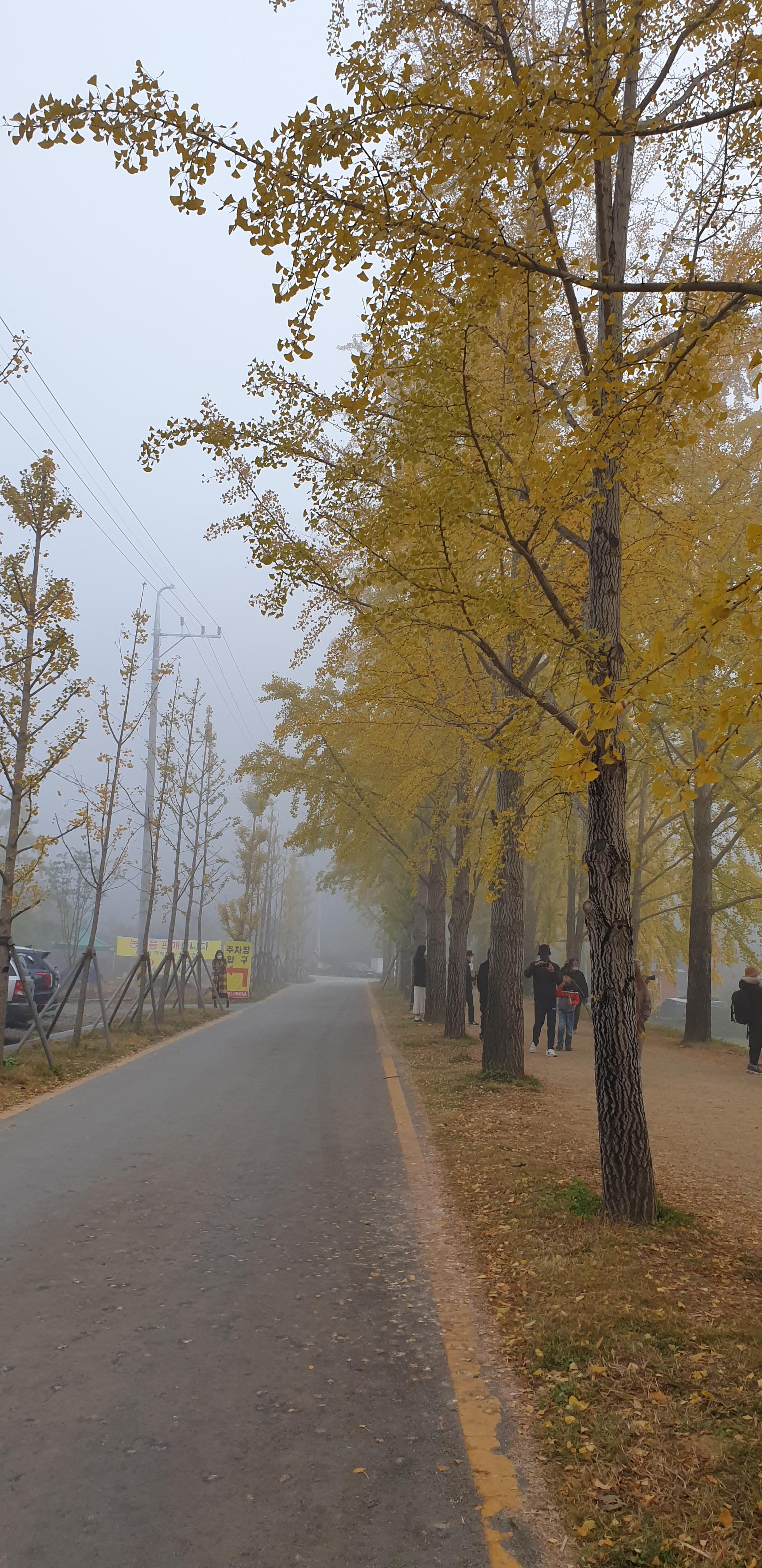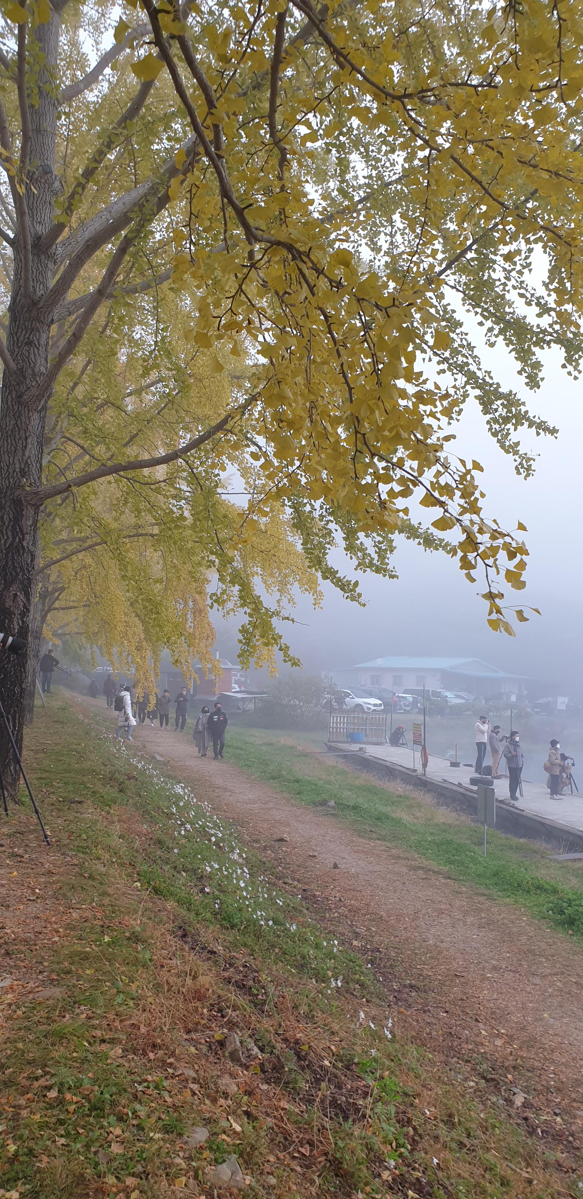 은행나무가 노랗게 물들고 저수지 물안개가 피어오르는 광경을