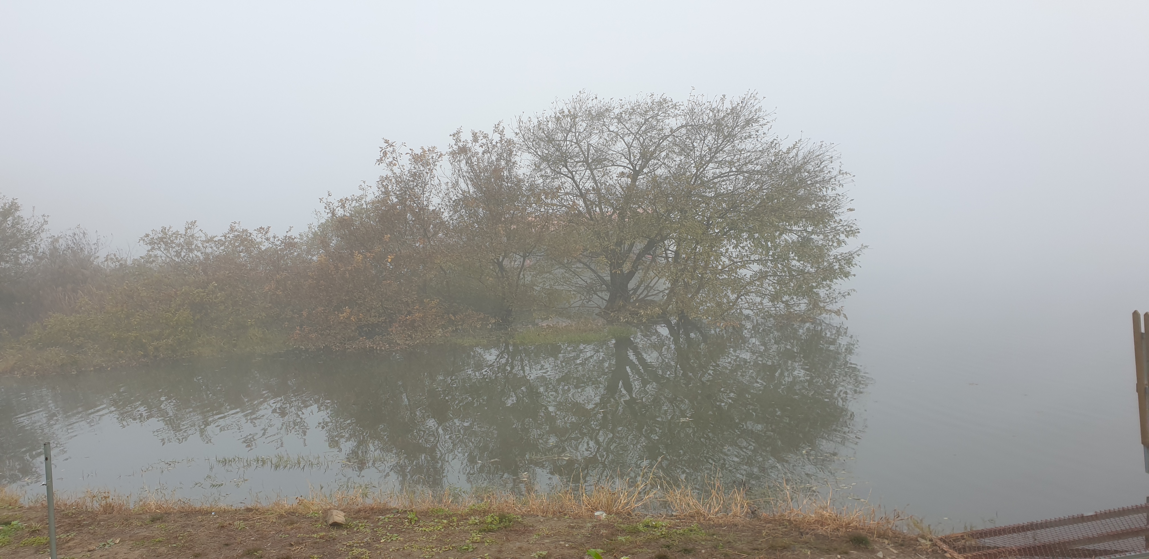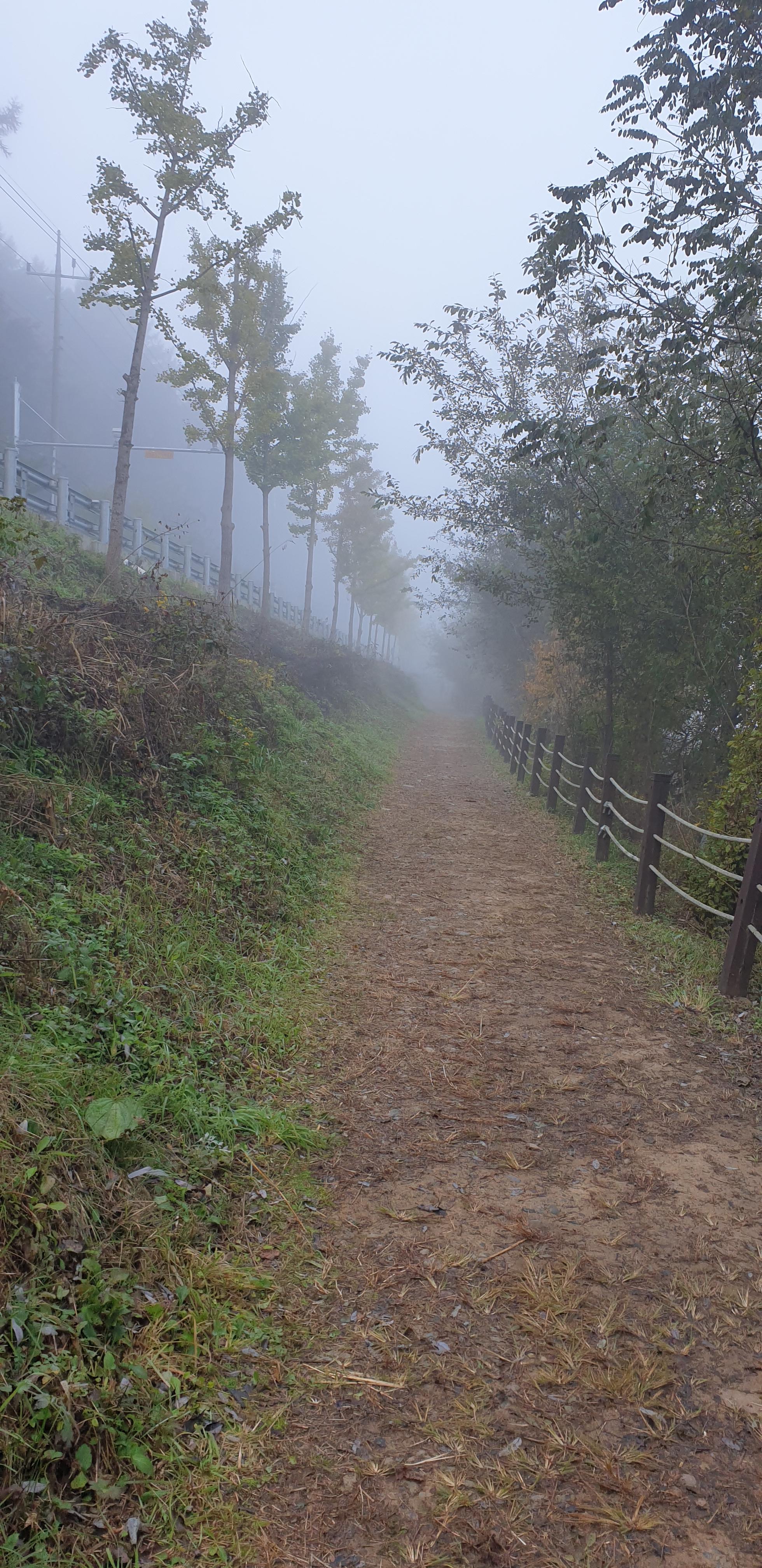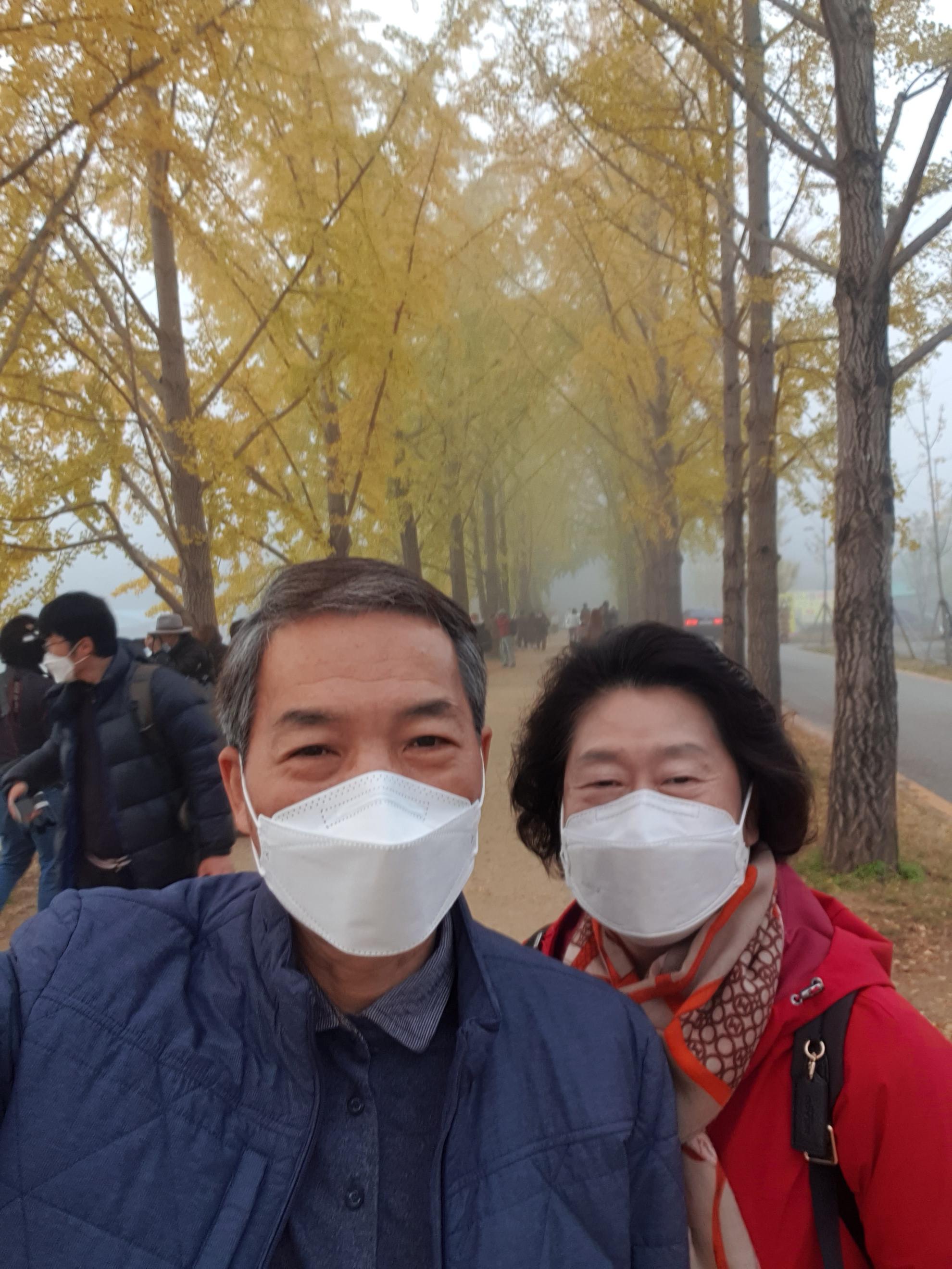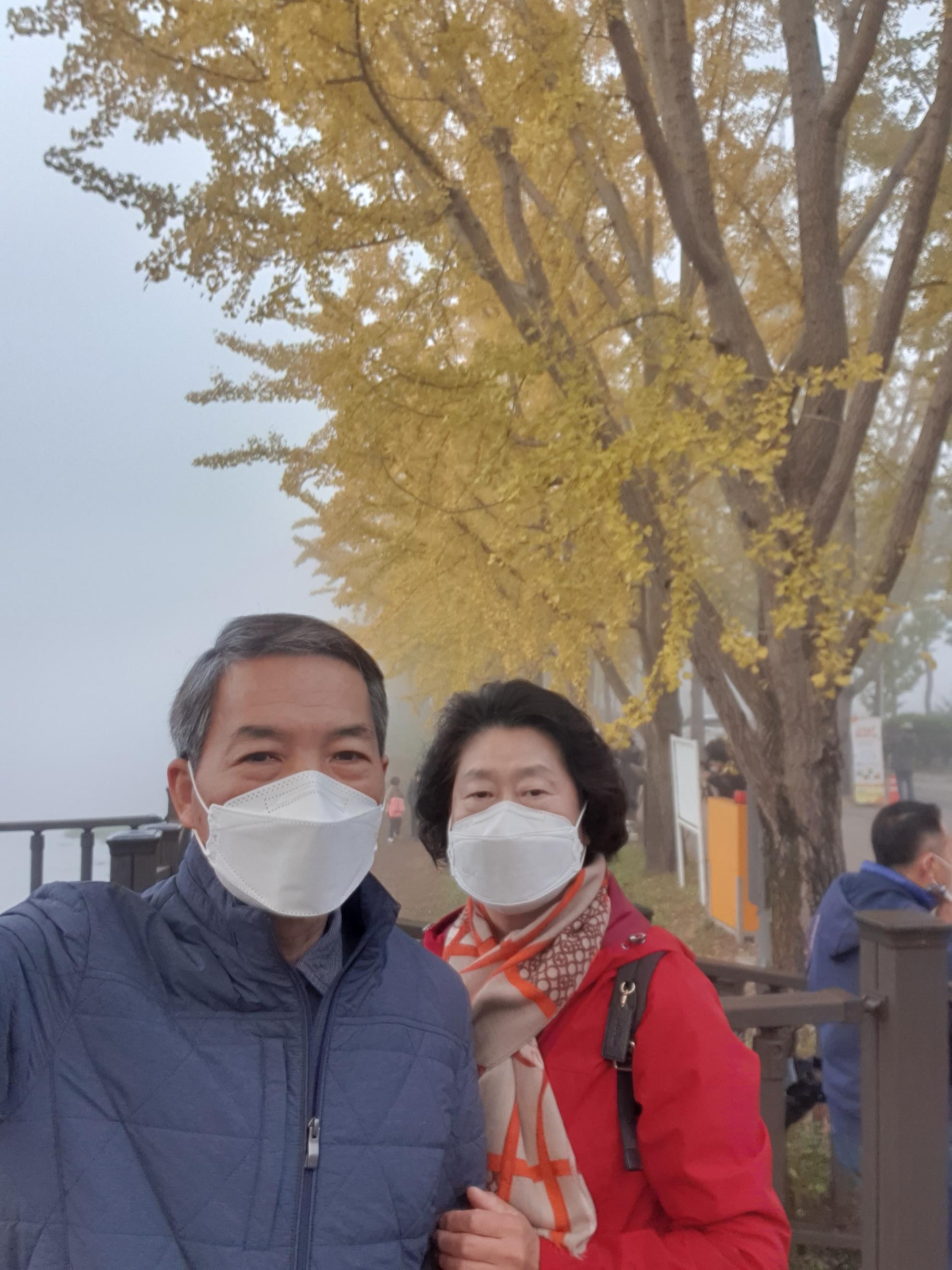 은행나무가 노랗게 물들고 저수지 물안개가 피어오르는 광경을