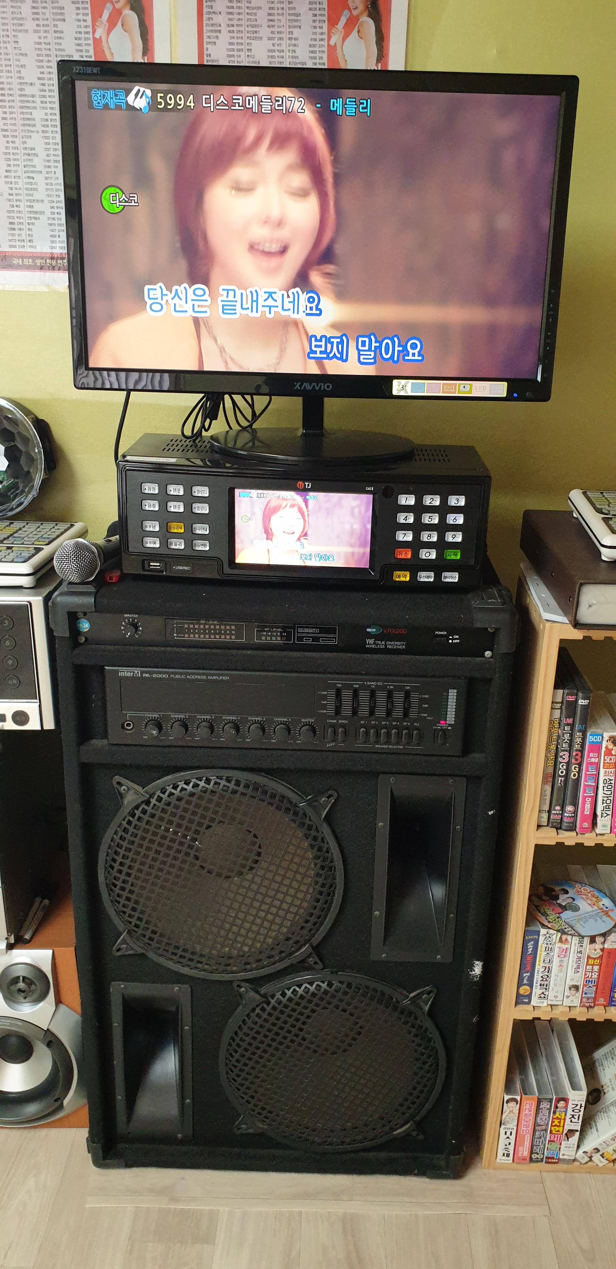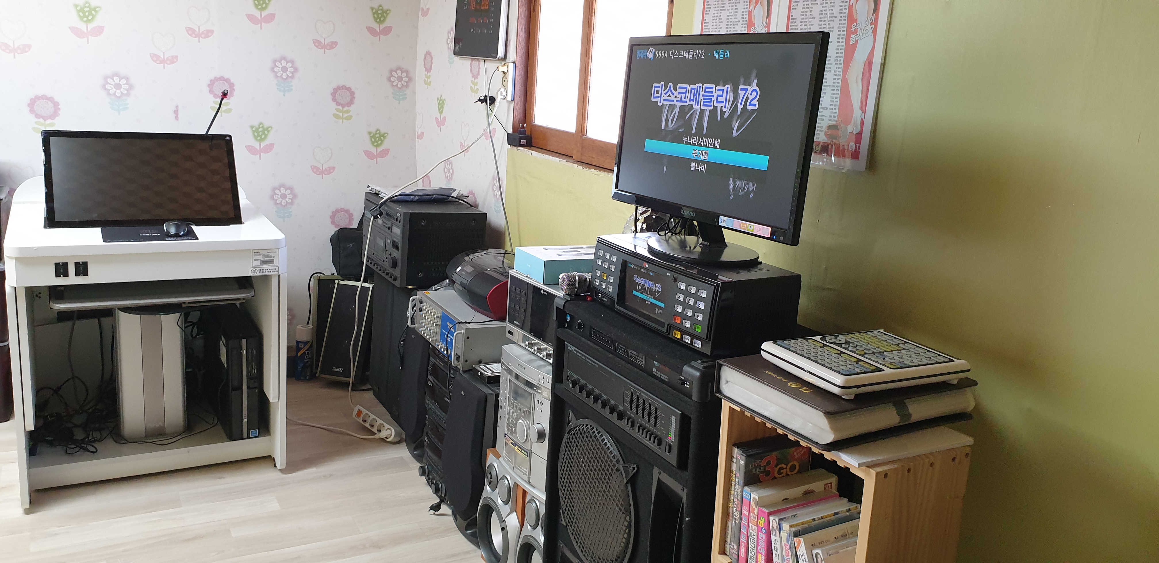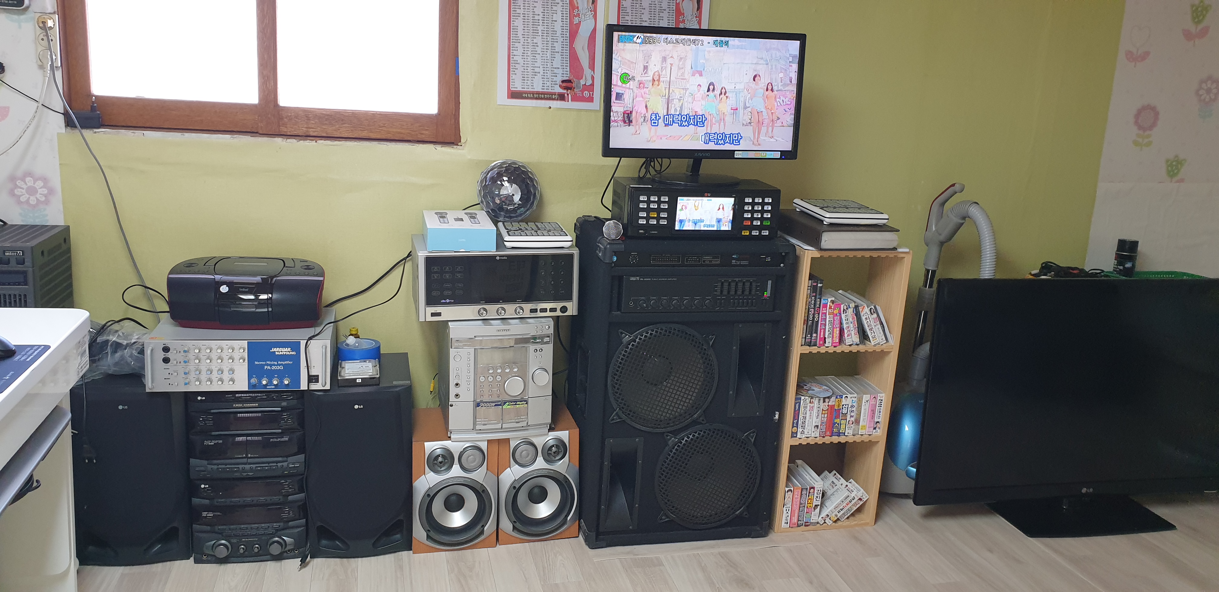 시골집 사랑방에 노래방기기 오디오 컴퓨터 스피커 여러가지