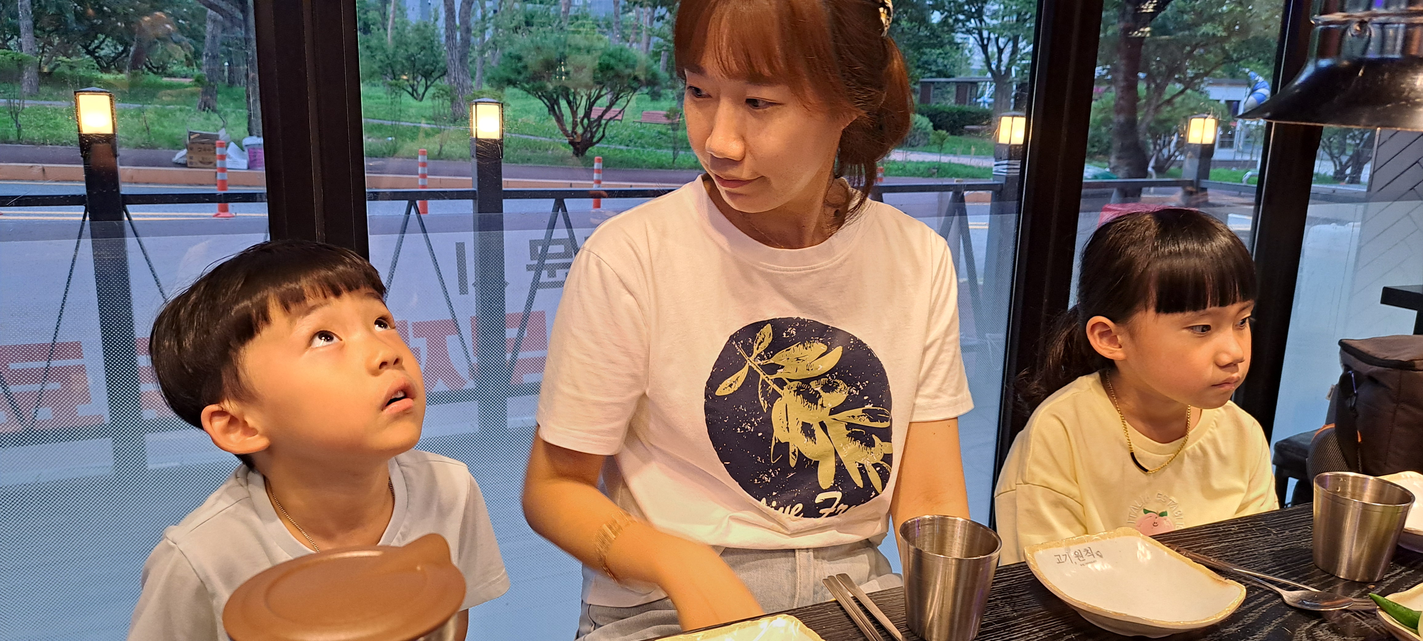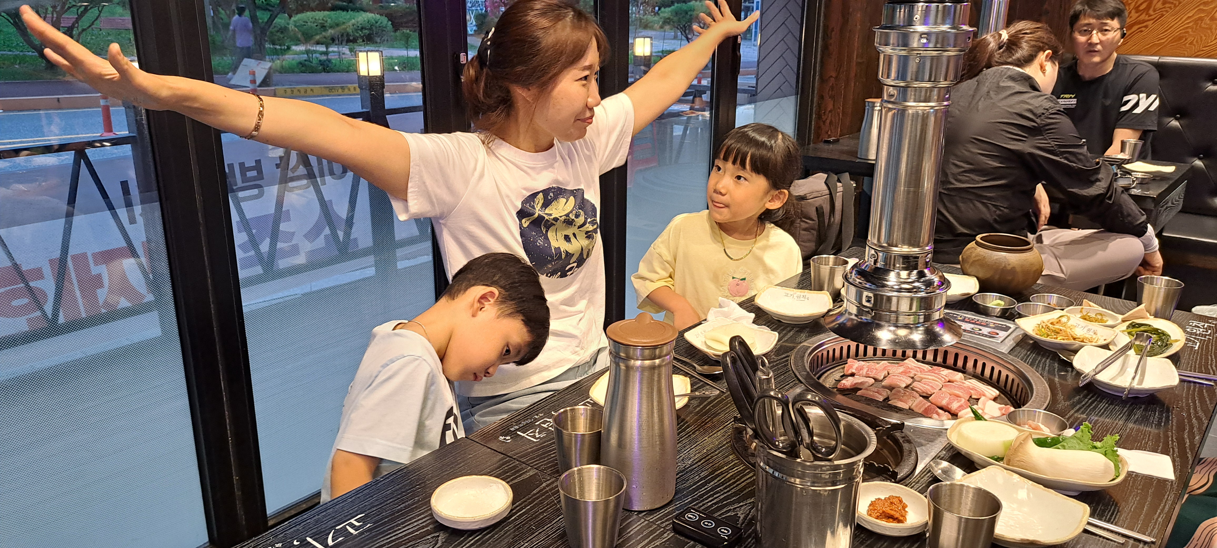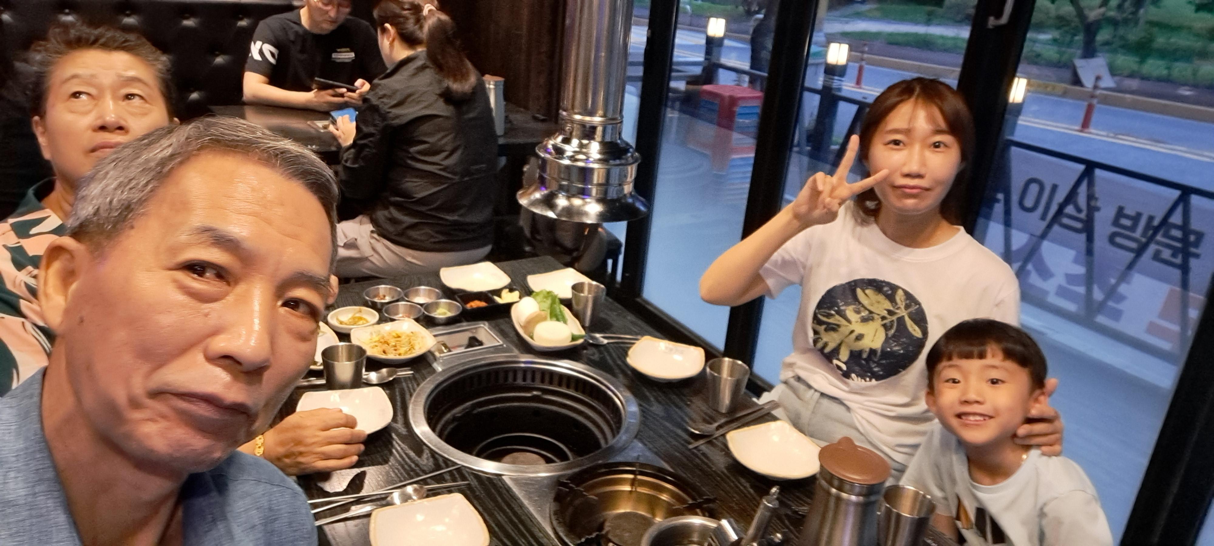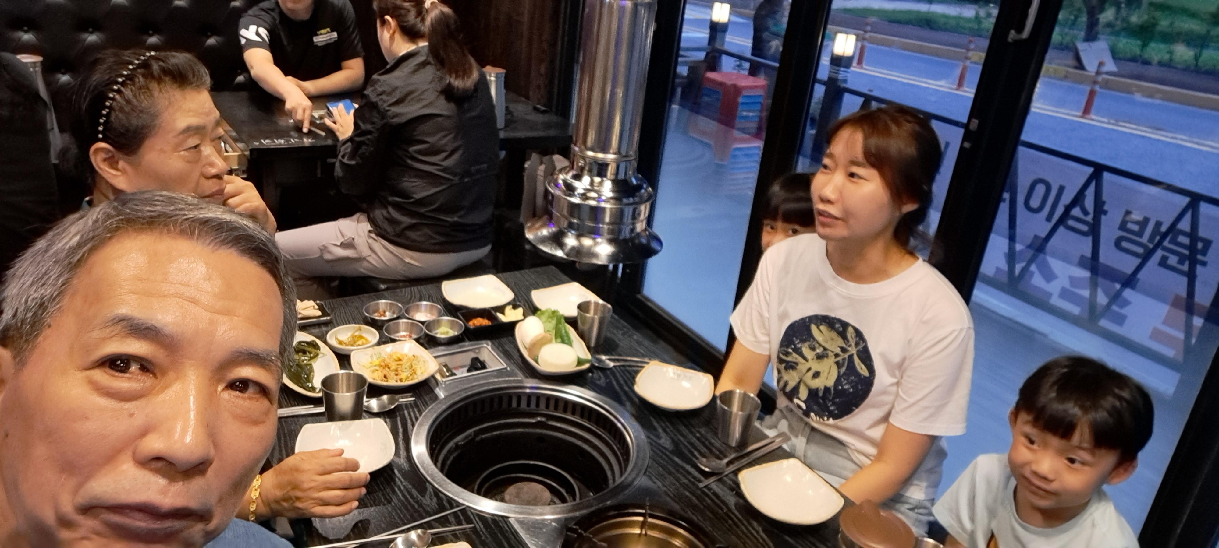 아이들과 고기 구워 먹고 있습니다